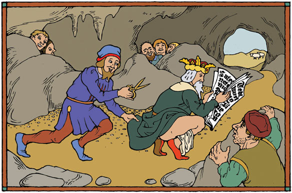 When Saul came to the sheepfolds he went into a cave to relieve himself. David and his men were hiding in the cave, and David’s men said to him, “The Lord has put your enemy right into your hands.” Then David stealthily crept up behind Saul and cut the skirt off his robe, and when Saul stood up and walked out of the cave David called after him “I could have killed you just now, but I didn’t!” Saul burst into tears and replied, “You are a good man. I know you will be king. Just promise you won’t kill my descendants.” And David promised him. Continued on page 21… — 1 Samuel 24 |