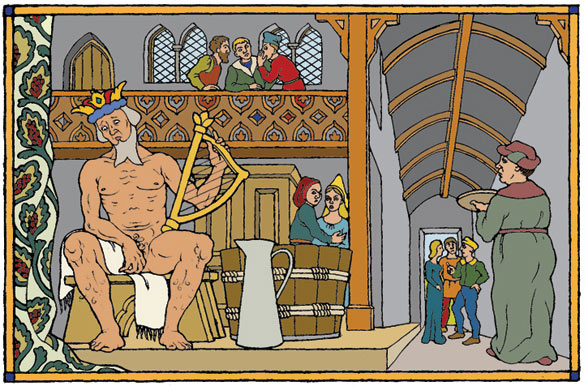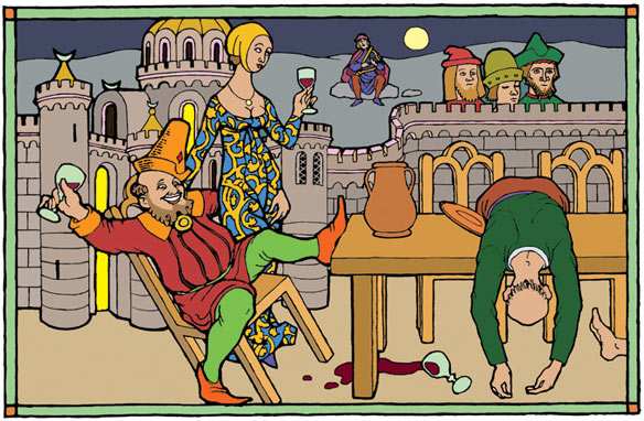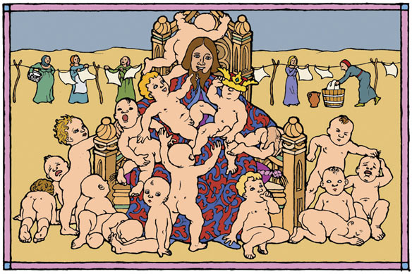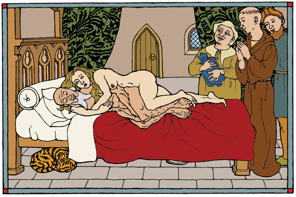 But Nabal said “Who‘s David? I can’t feed every stranger who turns up!” So David set off with four hundred of his men to attack Nabal. Now one of Nabal’s shepherds warned Abigail, and she hurriedly rode down the hill with food and wine to greet David. David said “I protected your husband’s sheep and got no thanks. I’ll kill all those who piss against the wall before morning.” Abigail got off the donkey and knelt before him, saying; “O lord, you’re such a good and holy man that you will definitely be king. Murder would be bad for your reputation, so let God deal with my husband; and when you are ruler over Israel, don’t forget me.” And David replied, “God bless you; without your advice there would have been none left of those who piss against the wall. I will spare your people, but take you for my own.” That night Nabal held a feast; he was merry, for he was very drunk, so Abigail didn’t tell him what David had said until the next day. Then he had a heart attack, and died. And when David heard that Nabal was dead, he said “Blessed be the Lord for killing Nabal, so I didn’t have to; it serves him right.” And he sent for Abigail to make her his wife. — 1 Samuel 25 |
