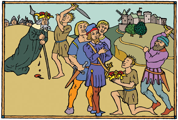 David asked the young man, “How do you know that Saul and Jonathan are dead?” The youth said, “I happened to be passing on Mount Gibeon, and came across a battle; and as I walked through it, I came across Saul, who was leaning on his spear. He called, ‘Who are you?’ and I answered, ‘I am an Amelekite.’ He cried, ‘Please kill me, for I‘m in great pain!’ So I killed him, for I knew he couldn’t survive his wound.” Then David tore his clothes and his men imitated him, and mourned and wept. He lamented “The beauty of Israel is slain; Saul and Jonathan were swifter than eagles and stronger than lions. O weep, you daughters of Israel!” David said to the youth, “How dare you kill the Lord’s anointed!” and told one of his young men “Kill him”. And the young man slashed the youth till he died. David said, “You’ve only yourself to blame, because you admitted “I killed the Lord’s anointed!” And David became king of Judah. — 2 Samuel 1 |