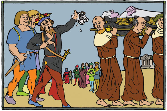 He came with twenty men, and David made them a feast. Abner said to David, “I’ll gather all our soldiers onto your side, so you can conquer whoever you want.” But when Abner left, Joab said to the king “What have you done? Why did you send him away? You must know he only came here to spy on you!” And Joab sent for Abner and stabbed him in the stomach. When David heard of this, he said, “Before God, I swear I had nothing to do with this! Blame Joab, and let his family be cursed. He killed Abner because Abner killed his brother.” And David said to Joab and all the people who were with him, “Tear your clothes, and dress in sackcloth!” And King David himself followed the coffin. He raised his voice, and wept at the grave of Abner; and all the people wept too. And the king wailed over Abner, and said, “You were killed by wicked men.” And all the people wept again. And David refused his meals, and the people noticed and were pleased, as they were pleased with whatever the king did. For all the people and all Israel understood that the king had nothing whatsoever to do with the murder of Abner. And David said, “Although I am anointed king, I feel weak today. Joab is too ruthless for me. May the Lord punish the evil-doer according to his wickedness.” — 2 Samuel 3 |