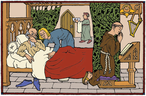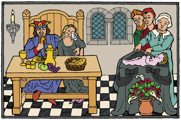 Then the Lord made the child of David and Uriah’s wife very sick. David prayed to God for the child, and he stopped eating and lay all night on the ground. The elders tried to make him get up and eat, but he refused. And when the child died, the servants were afraid to tell David, saying, “He’ll be heartbroken.” David saw his servants whispering, and asked, “Is the child dead?” And they said, “He’s dead.” Then David got up and washed and prayed and sat down to his supper. His servants asked, “Why did you fast and weep when the child was alive, but now the child is dead you’re eating heartily?” And he replied, “Now he’s dead, why should I fast? Can I bring him back?” And David comforted Bathsheba and had sex with her. — 2 Samuel 12 |