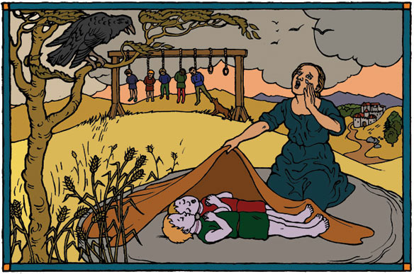 They answered, “Give us seven of Saul’s descendants, so we can cut off their arms and legs.” And the king said, “Alright.” The king took the two sons of Rizpah and the five sons of Merob, who were Saul’s grandsons, and gave them to the Gibeonites; and the Gibeonites hanged them on the hill, where all seven fell together in the first days of the barley harvest. Then their mother Rizpah took sackcloth and spread it over the bodies until it began to rain, and she wouldn’t let the birds feed on them during the day, nor the wild animals at night. — 2 Samuel 21 |