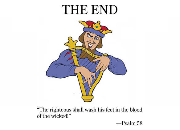 And Shimei is still with us, who cursed me so unpleasantly when he came to meet me at the river Jordan. I swore I wouldn’t kill him, but you’re a wise man and know what you have to do; bring him also to a bloody end!” So David slept with his fathers, and was buried in the city of David. — 1 Kings 2 |