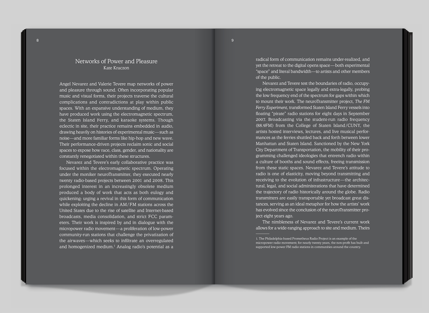 In 2016 we were commissioned to design a catalogue for the Angel Nevarez and Valerie Tevere show at ICA Philadelphia. Their work uses video and sound, and is so diverse that our challenge was to identify and distill a few common themes into book form.