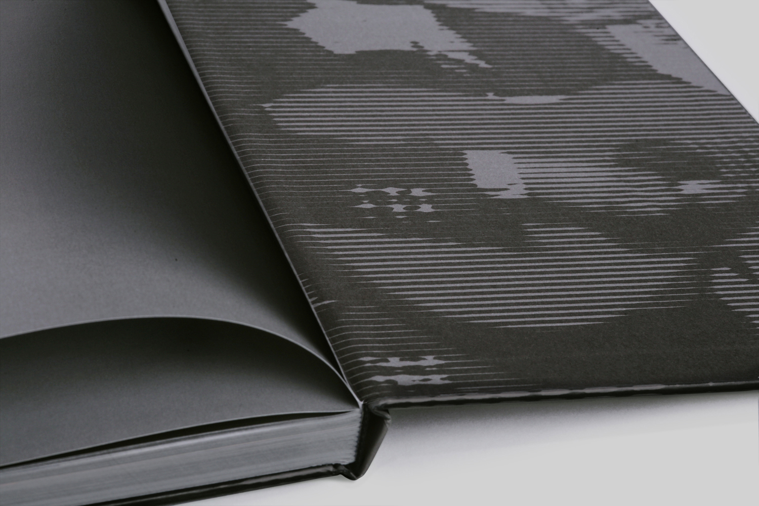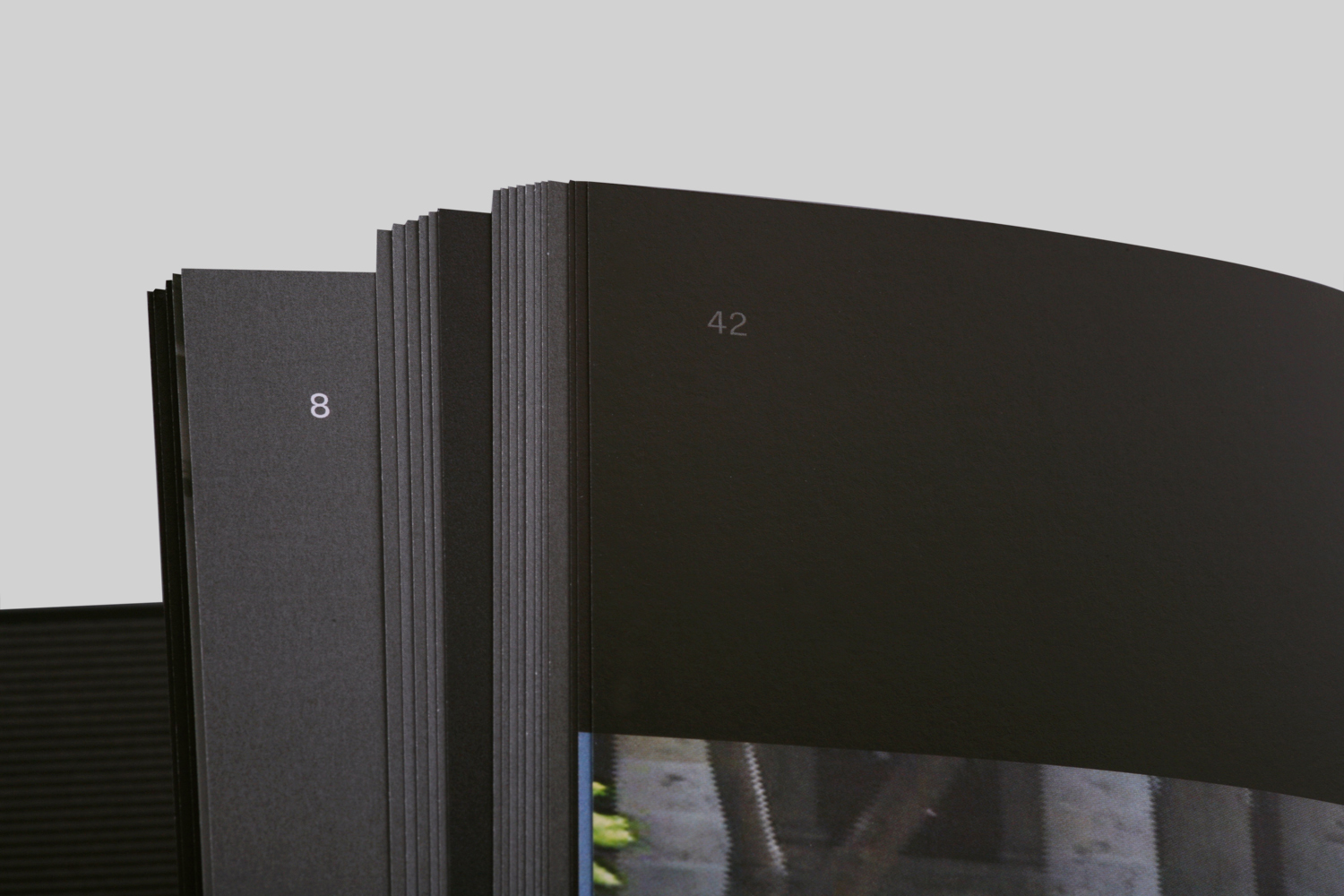 Returning from the show we considered making a book which, like their art, was predominantly dark in context. We wanted the white space to be black and the black type to be white; like a microfiche film found in a library. Still, the idea of a black book gave us some trepidation, knowing the inherent production problems. White type at a small scale can create a blemish of fuzzy color around its edges when knocked out of a field of rich (CMYK) black. This imperfection can be avoided by using registration black (K), but then the depth of blackness is sacrificed.
