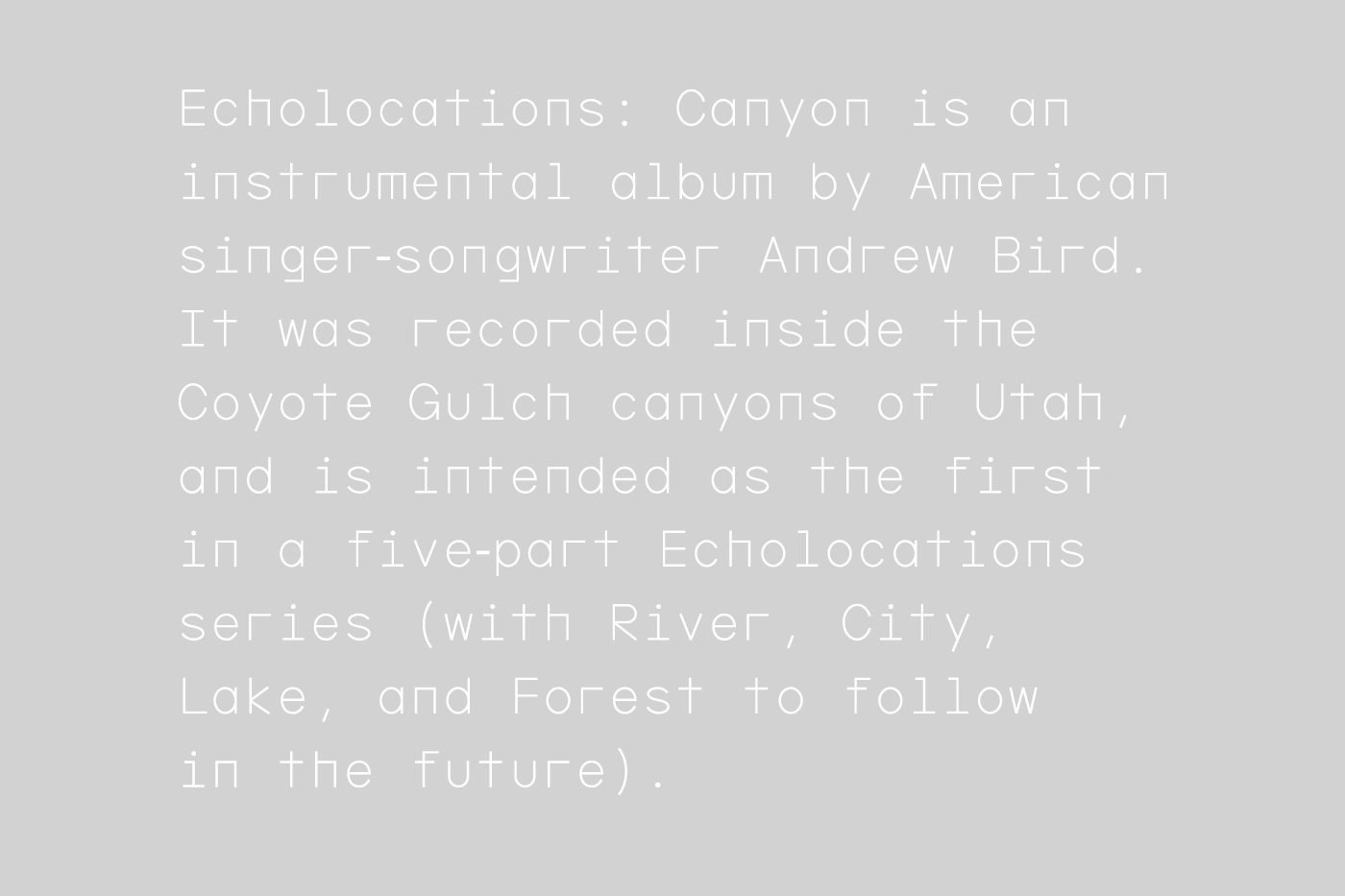 The Echolocations series is an ongoing musical project conceived by Andrew Bird, who travels to sonically inspirational sites; there he improvises violin compositions based on the acoustics of the spaces which surround him. The first installment took place in Southern Utah at Coyote Gulch, beneath a naturally occurring sandstone arch.