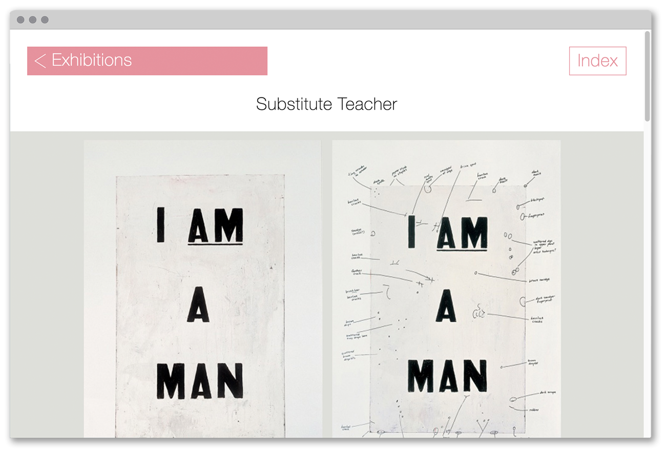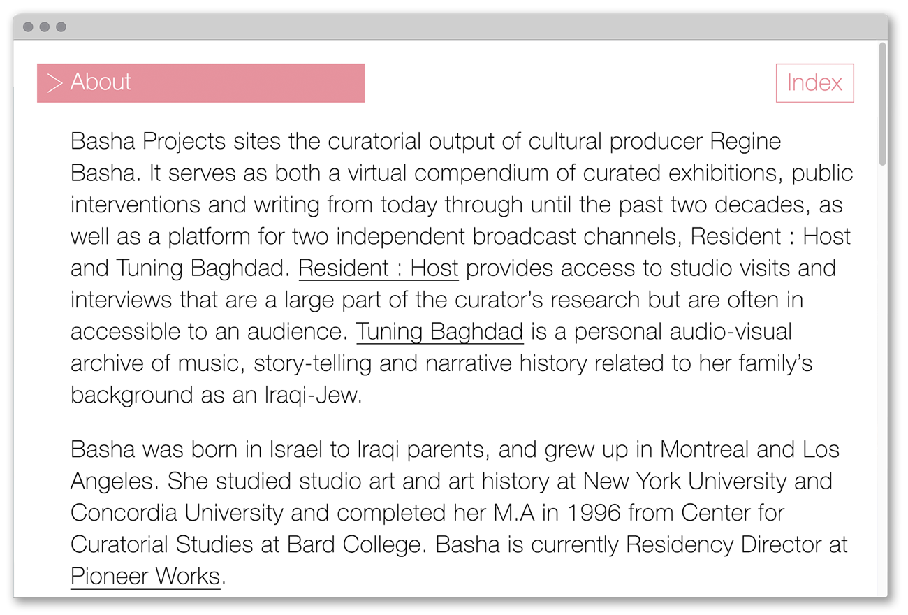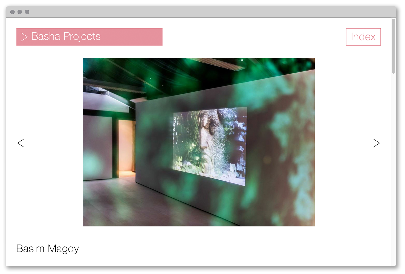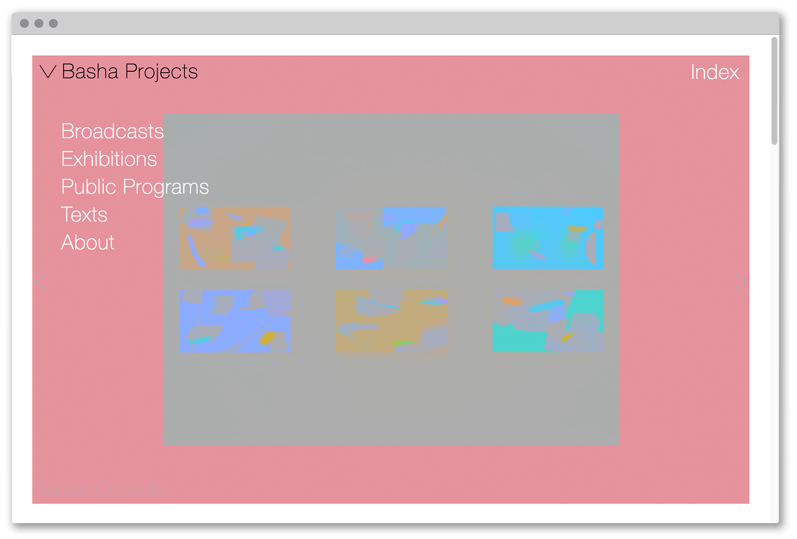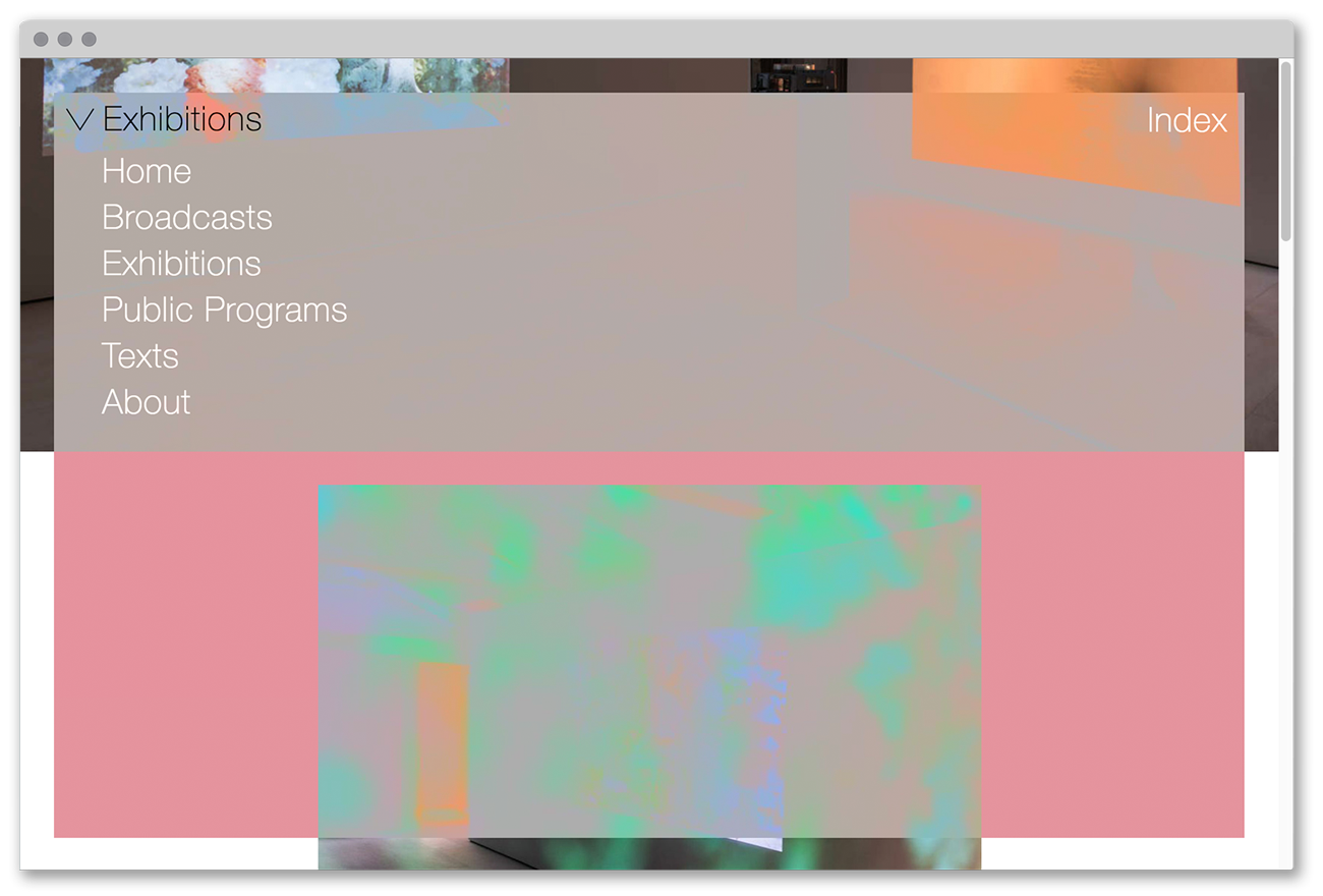 Users on Chrome/Firefox browsers will see the exclusion effect create unexpected color overlays when the menu is activated. We liked the idea of emphasizing this separate Basha layer. You could say it’s metaphor speaking to the role of a curator, both attached yet separated from the artwork being shown.